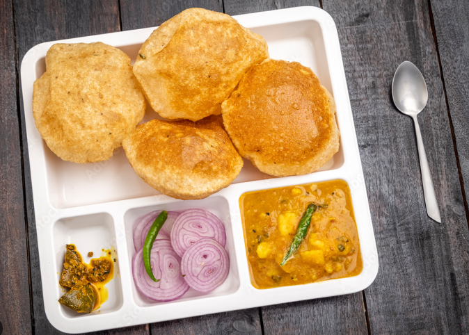 ![]() Full Thali meal with Roti, Rice, Dal, sabzi, curd, salad & sweet |